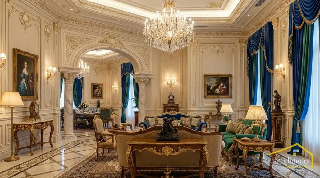 Luxury European interior design often uses rich yet soft tones such as ivory, gold, beige, royal blue, emerald, and burgundy. These are attractive, elegant colors that create warmth and opulence in the luxurious apartment.